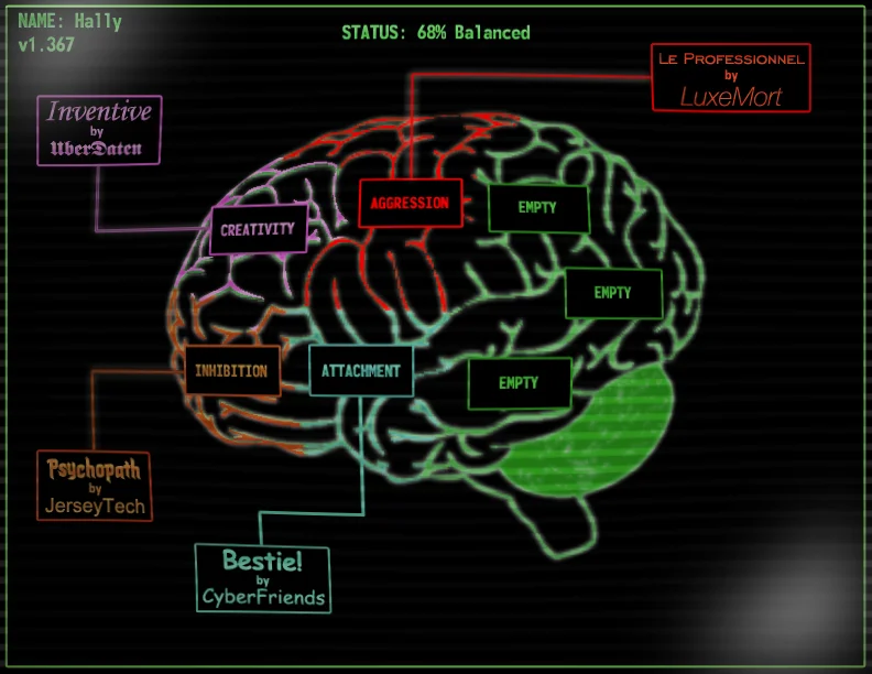 The player has chosen to infiltrate the GunTex corporation to steal weapon schematics to add to the player’s weapon fabrication database. In HackAI, facilities often have very few human employees, as most day-to-day operations are handled by AI robots and holograms. In this scene, the player has a mildly unstable AI the following subroutines: Bestie! (An Attachment subroutine making the AI a “best friend”) Psychopath (An Inhibition subroutine that allows the AI to be violent) Inventive (A Creativity subroutine that allows the AI to suggest actions) and Le Professionnel (An Aggression subroutine that configures the AI’s aggressive behavior to be styled like a french assassin).