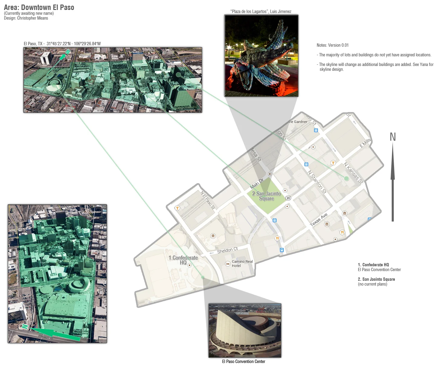 After choosing El Paso as the site for Fallout: Lonestar, the city's smaller nature made further decisions rather simple. A major wasteland city would have to reside in downtown El Paso, especially if we were going to feature any of the city's landmarks. So I went to the business of carving out a place for the Lonestar's Confederacy, a city that would later be known as "Graveyard."